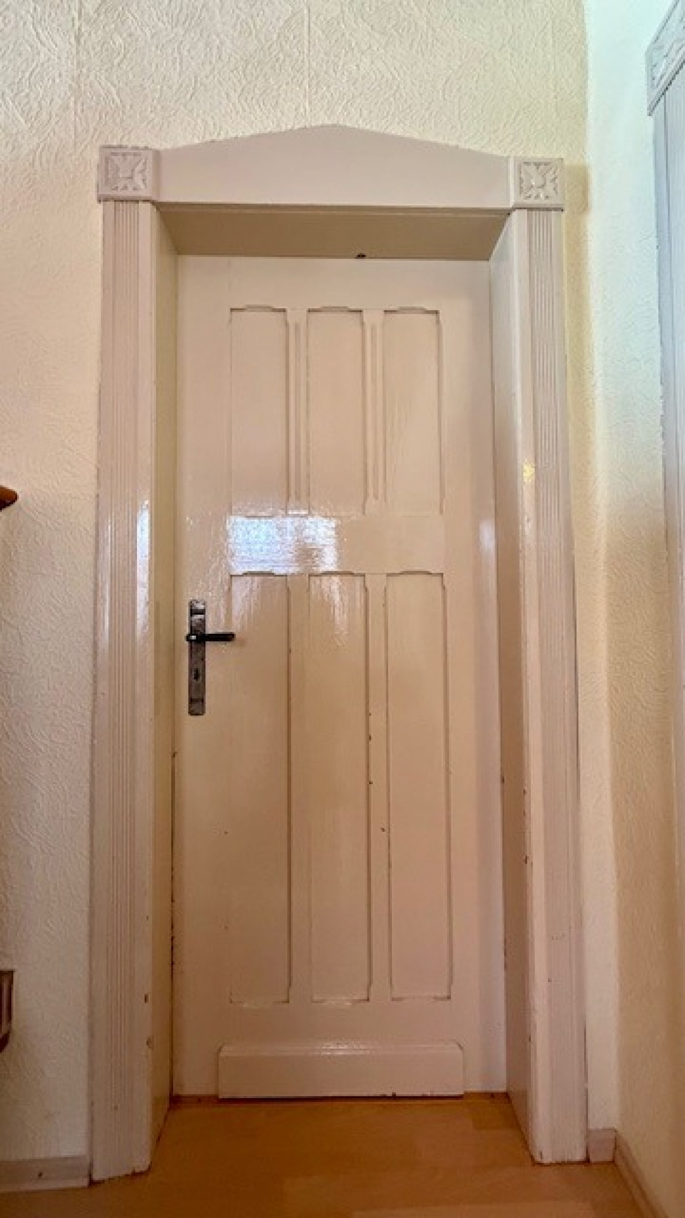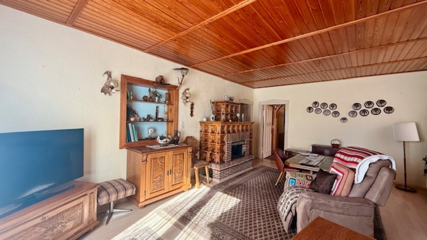 Im Erdgeschoß befindet sich ein großes Wohnzimmer mit offenen Kamin, das moderne Duschbad mit bodentiefer Duschwanne und 2 weitere Zimmer. Alte Ausstattungsmerkmale aus dem Baujahr wie Holztüren mit verzierten Rahmen sind vorhanden.